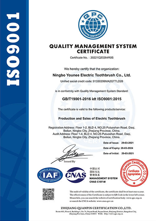 Somos una empresa certificada ISO 9001 y BSCI. Nuestros productos han obtenido numerosas certificaciones internacionales, incluidas CE, RoHS, Reach, FCC, PSE y LFGB, y se exportan a más de 50 países en todo el mundo. Equipados con 6 líneas de producción, nuestra producción mensual de cepillos de dientes eléctricos alcanza las 200.000 unidades y aceptamos pedidos personalizados ODM/OEM. Invertimos no menos del 8% de nuestros ingresos anuales en I+D, y nuestro equipo de investigación y desarrollo lanza 3 modelos innovadores cada año.